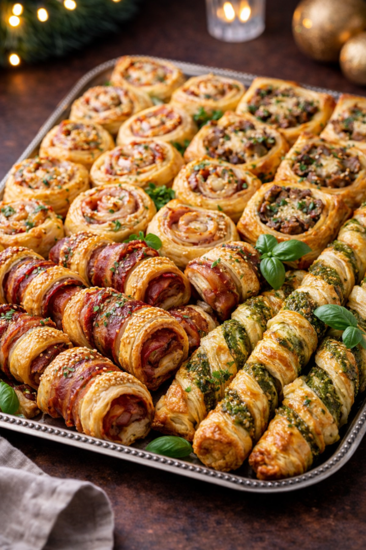 Roladki z ciasta francuskiego – Imprezowy box- trzy warianty (salami, pesto, pieczarki)