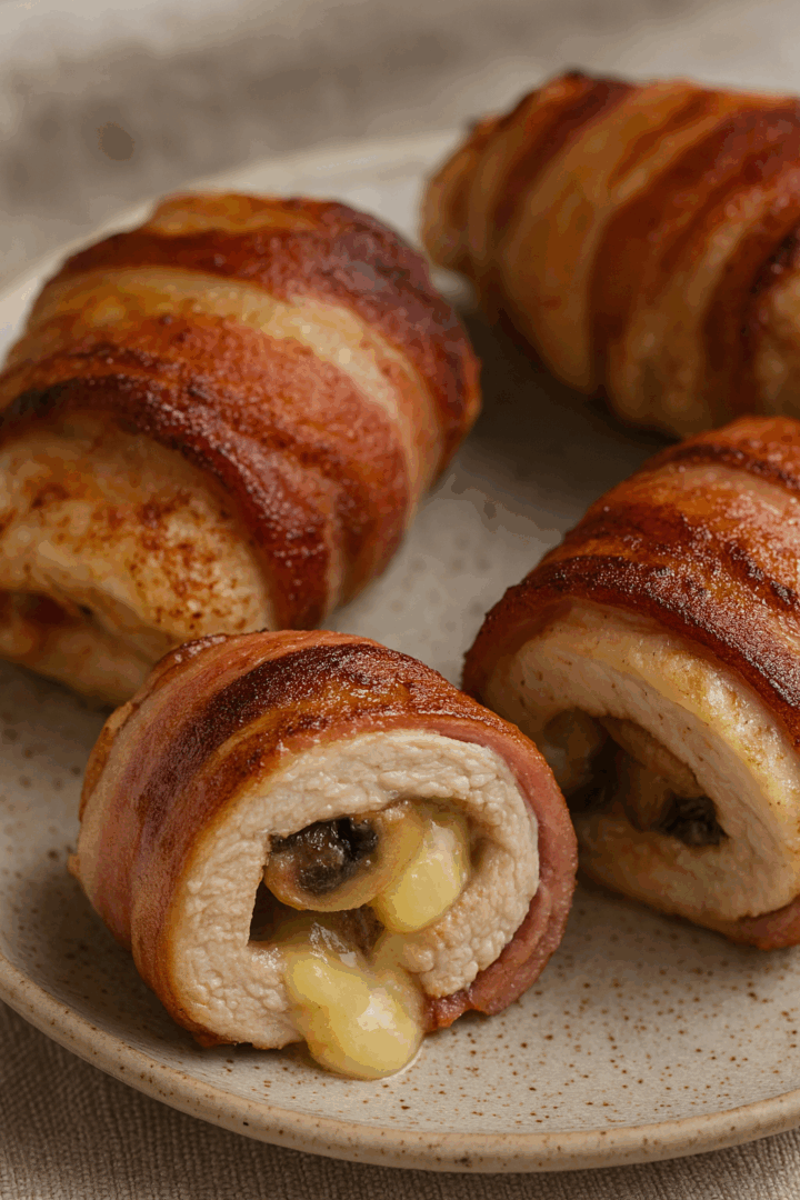 Roladki z kurczaka z pieczarkami i serem w boczku
