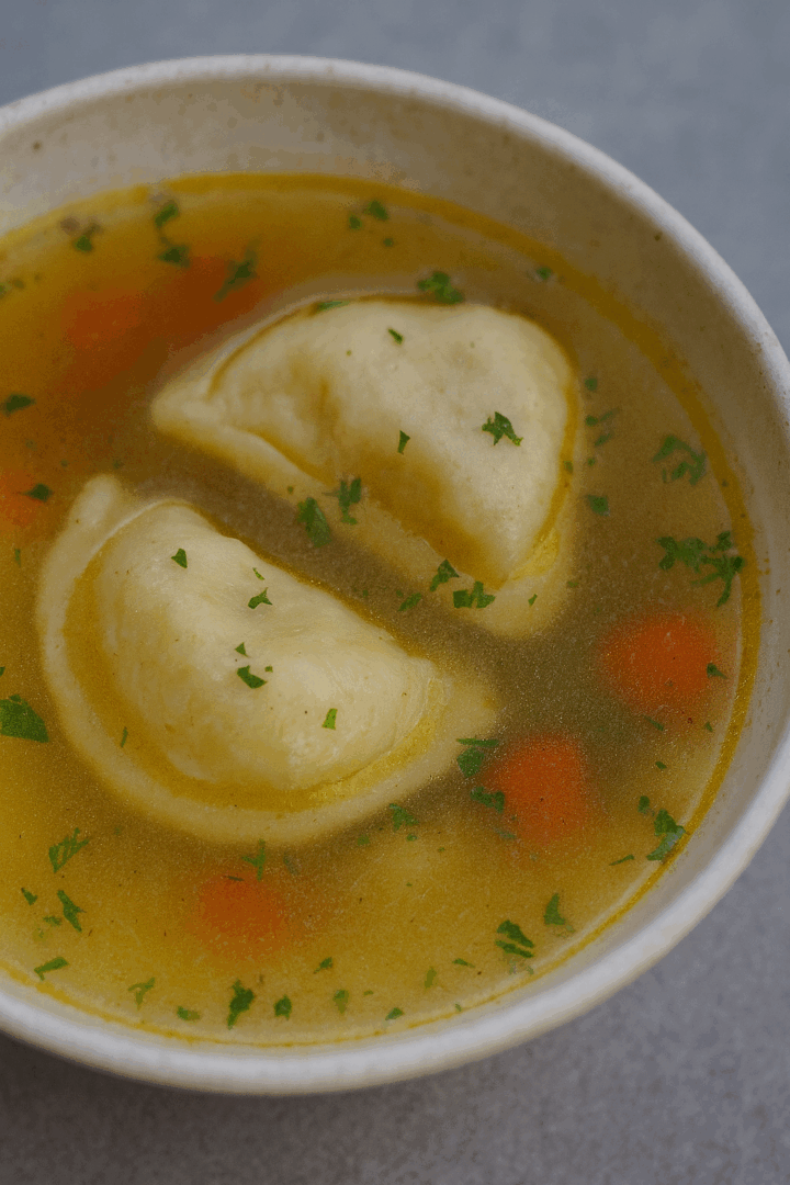 Do talerza włóż 2–3 pierożki, zalej gorącym rosołem. Posyp świeżą natką pietruszki.