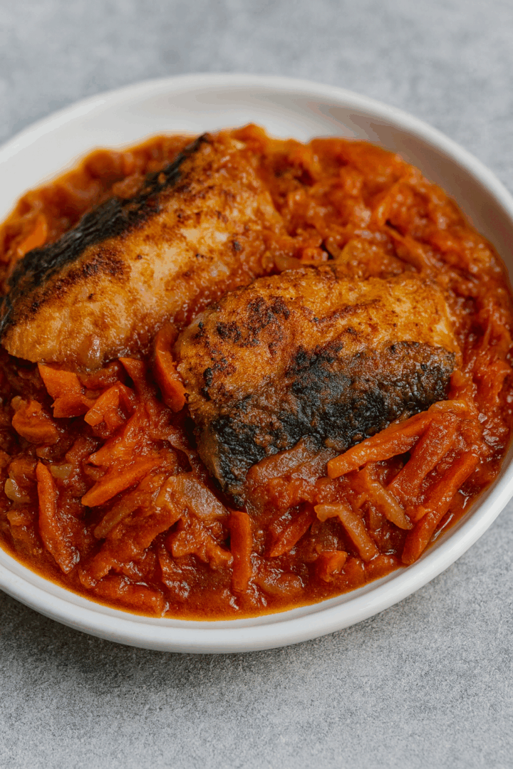 W naczyniu układać warstwami: sos warzywny – ryba – sos warzywny.