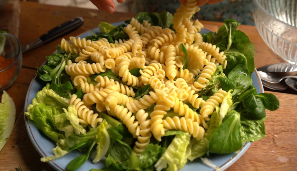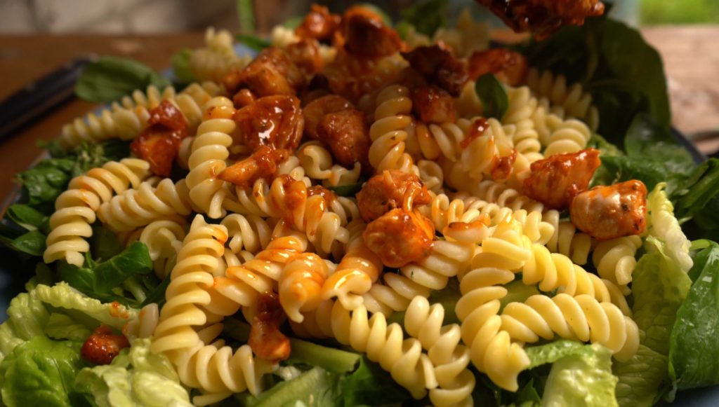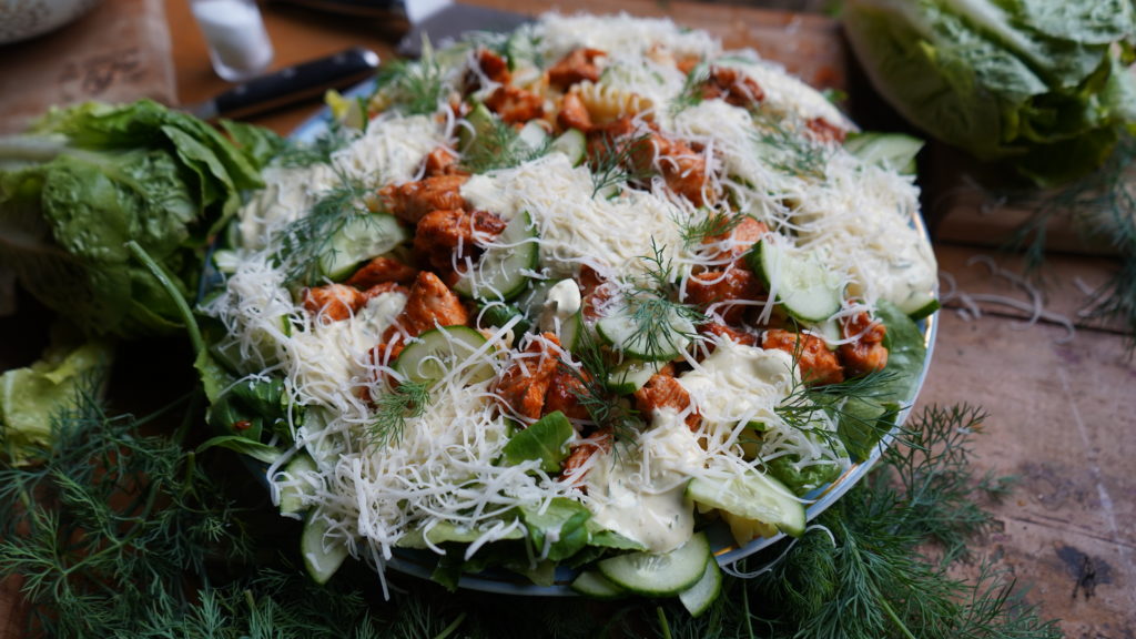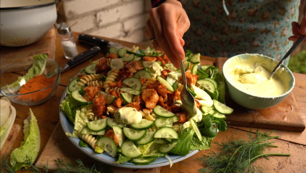 Na duży półmisek lub talerz porwij sałatę rzymską. Na sałatę wyłóż roszponkę. Następnie wyłóż makaron, kolejno wyłóż: usmażonego kurczaka, a także pokrojonego ogórka.
