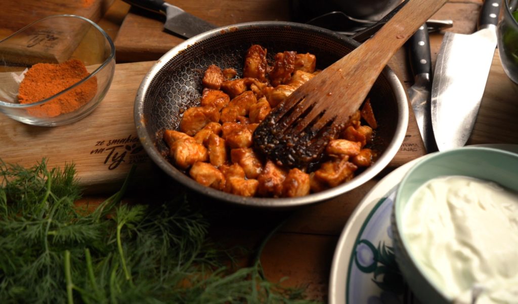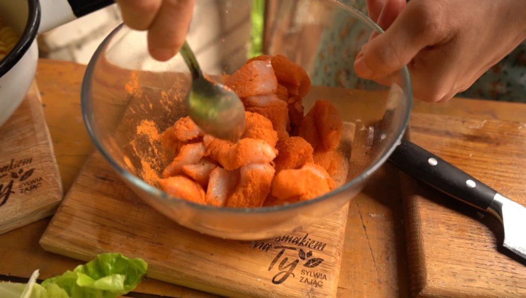 Pierś z kurczaka oczyść. Pokrój w kostkę. Posyp przyprawą wymieszaj.