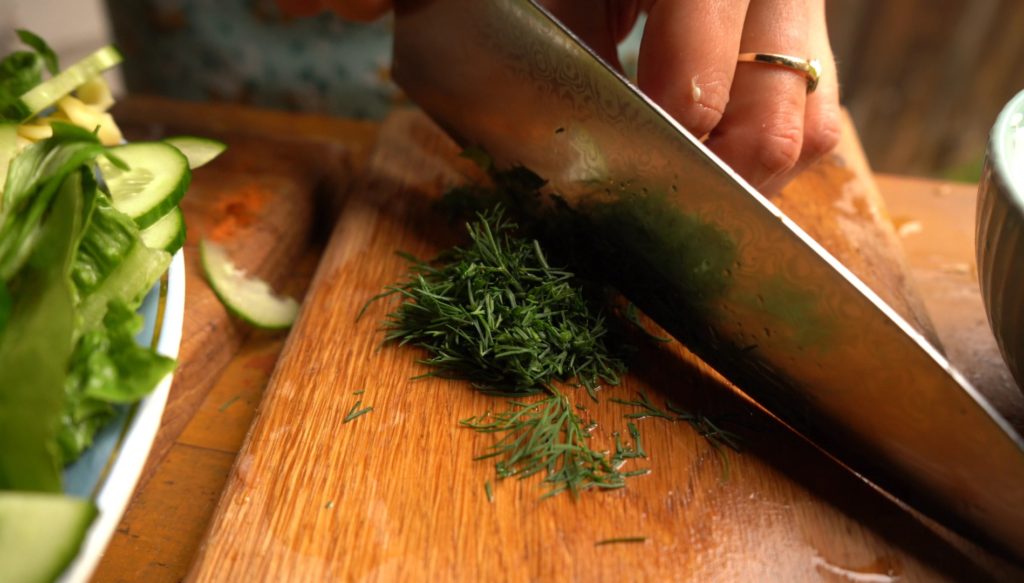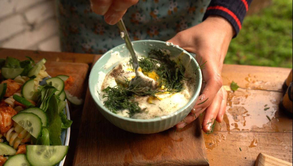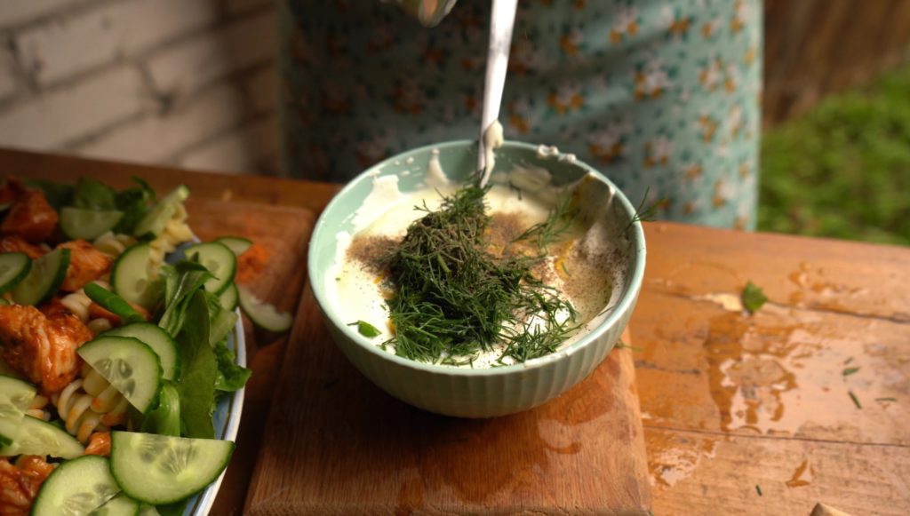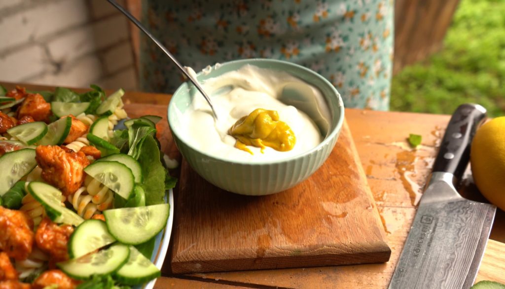 Przygotuj sos. Do miseczki włóż 4 łyżki jogurtu greckiego oraz 2 łyżeczki musztardy miodowej. Dopraw solą i pieprzem do smaku. Wlej sok z 1/2 cytryny. Wsyp posiekany pęczek koperku. Wymieszaj.