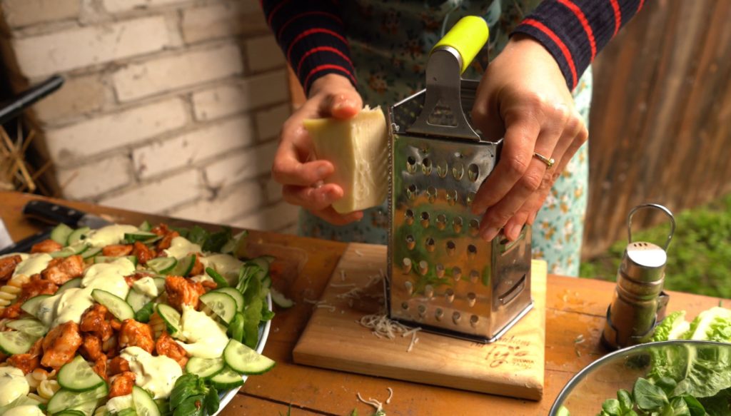 Wykładaj sos na sałatkę. Zetrzyj ser na tarce. Wyłóż go na wierzch sałatki. I gotowe! Ciesz się smakiem razem ze mną!