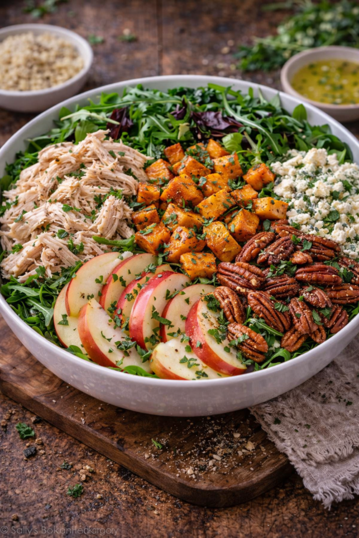 Sałatka bowl z kurczakiem, batatem, jabłkiem i pekanami