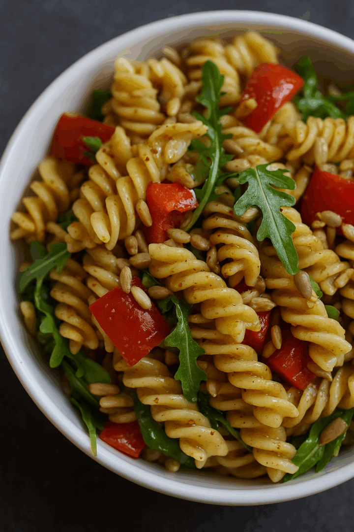 Sałatka makaronowa z rukolą, papryką i pestkami słonecznika
