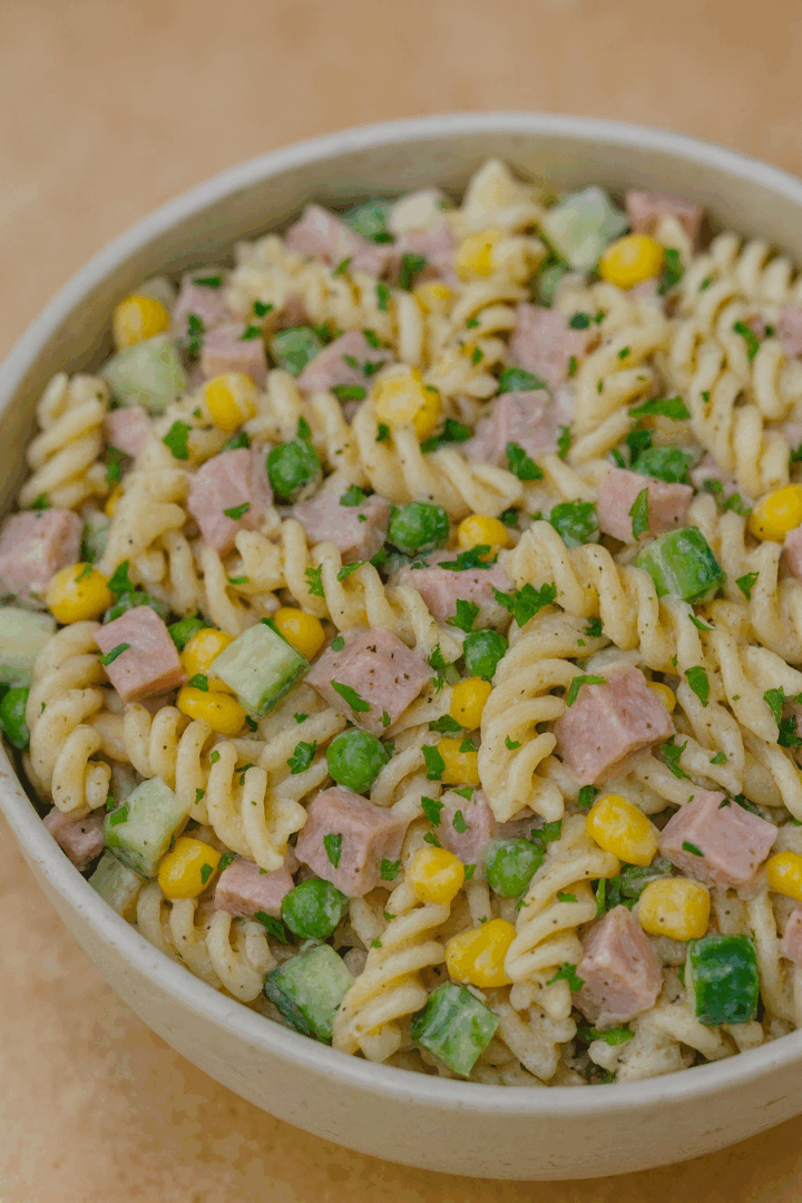 Sałatka makaronowa z szynką, kukurydzą i groszkiem