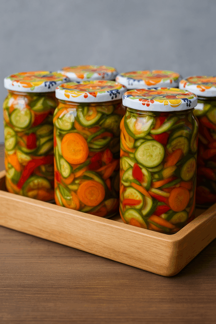 Ułożyć warzywa w słoikach ciasno, warstwami, mieszając kolory.