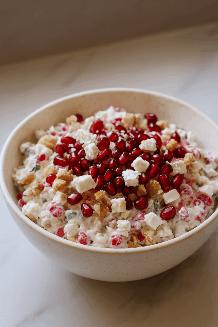 Przełóż sałatkę do miski i udekoruj wierzch pozostałymi ziarnami granatu, kawałkami fety i orzechami.