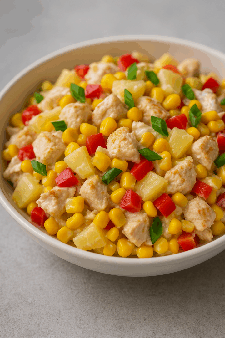 W dużej misce wymieszaj kurczaka, ananasa, paprykę i kukurydzę.