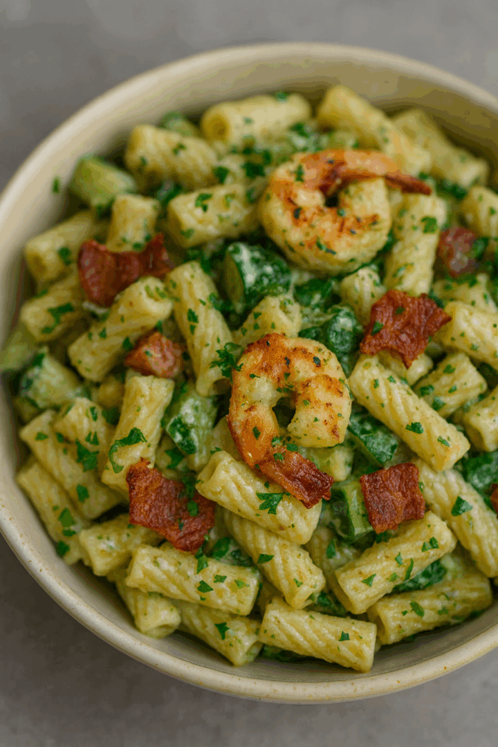 Sałatka z makaronem, krewetkami, boczkiem i pesto
