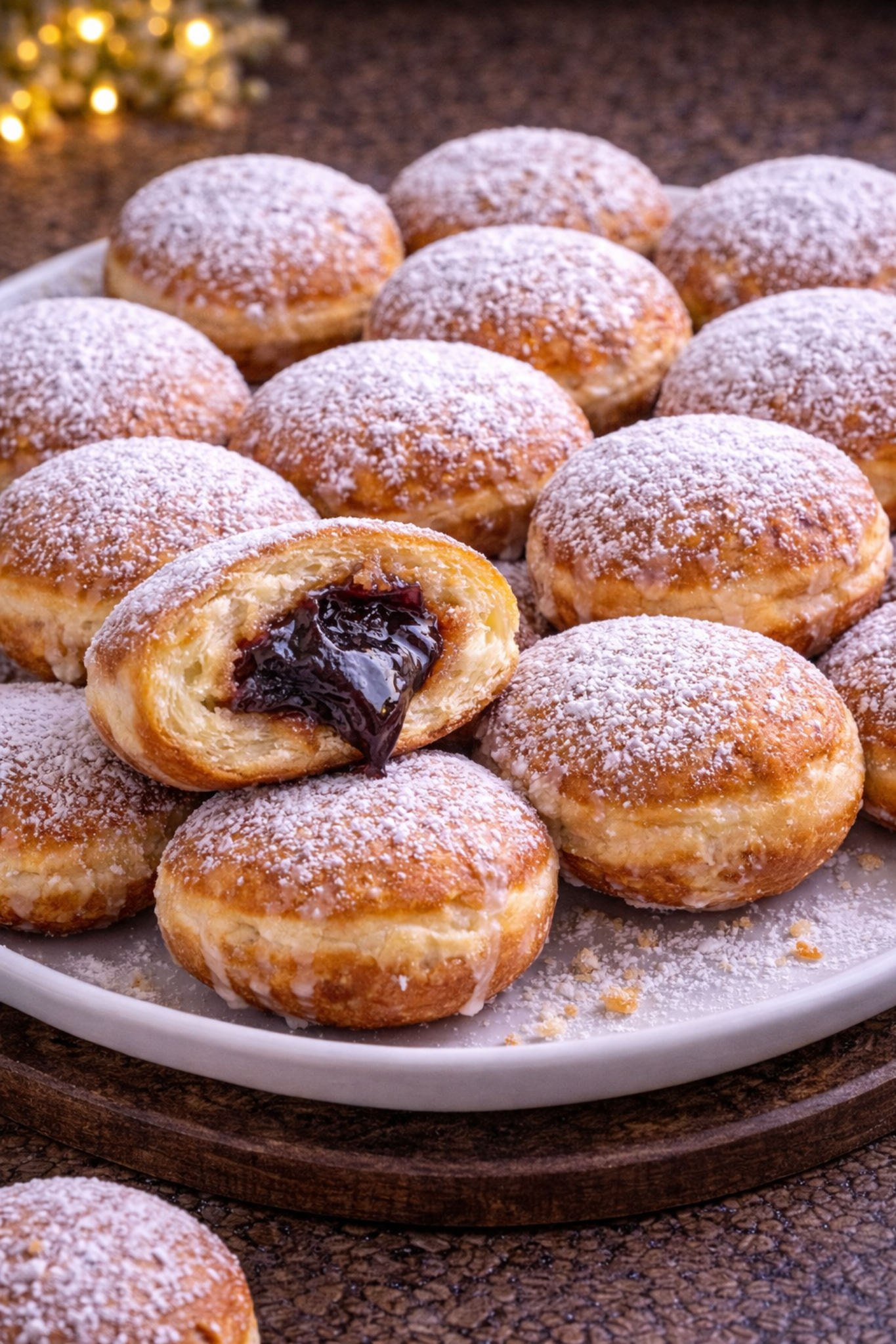 Pączki drożdżowe z nadzieniem czekoladowym, posypane cukrem pudrem