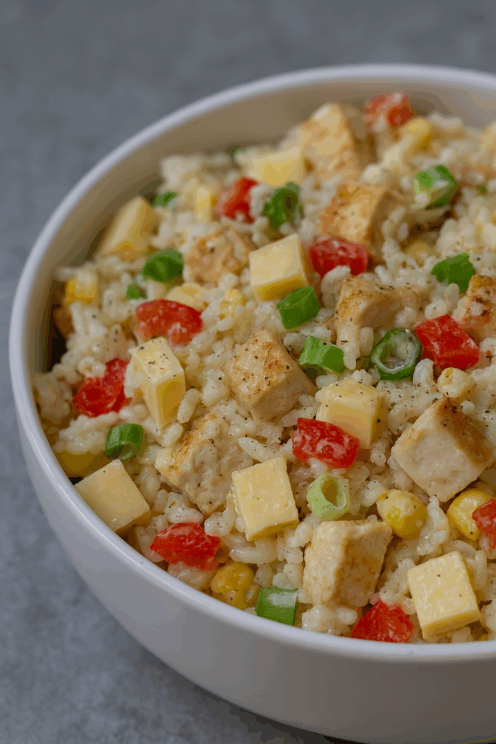 W dużej misce wymieszaj ryż, kurczaka, paprykę, kukurydzę, ser i szczypiorek.