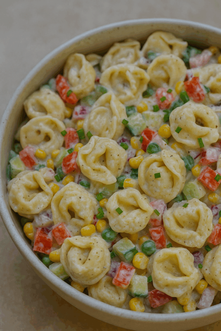 W dużej misce wymieszaj tortellini, kukurydzę, groszek, paprykę, ogórek i szczypiorek.