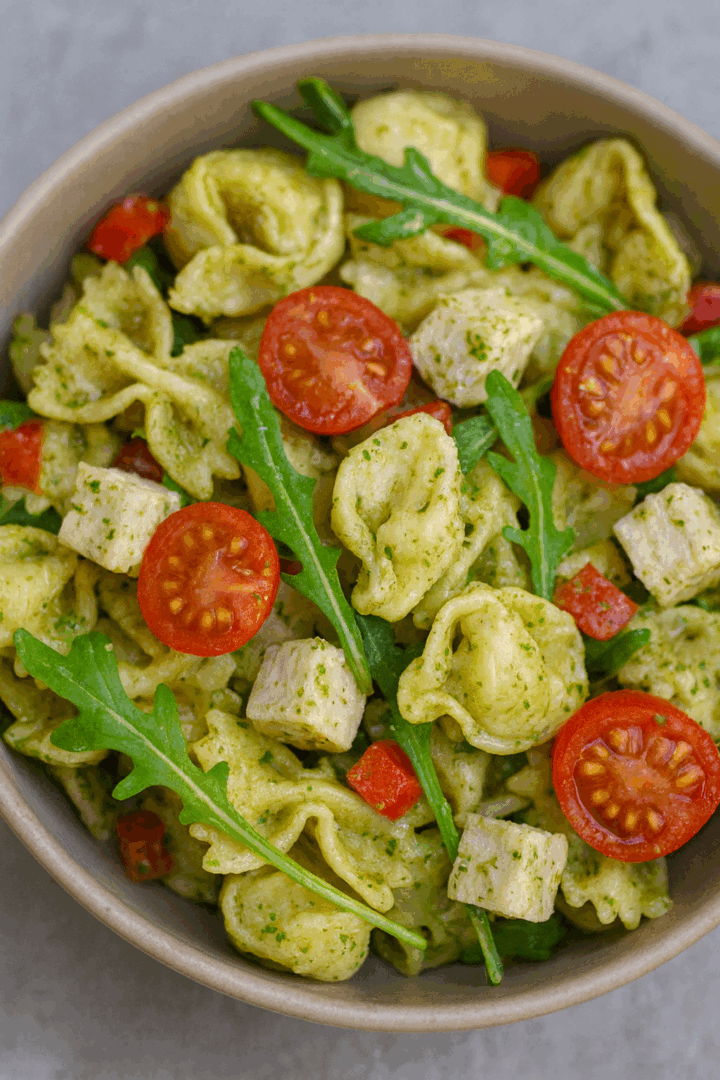 W dużej misce połącz tortellini, kurczaka, pomidorki, paprykę i rukolę.