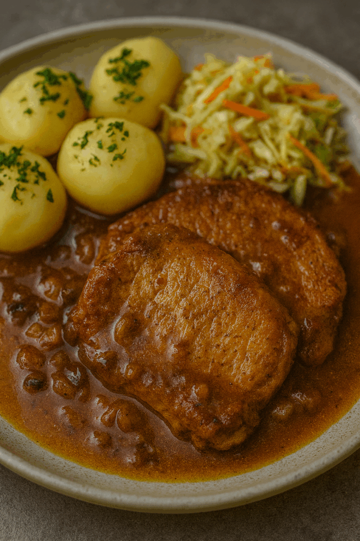 Na talerzu ułóż 2–3 plastry schabu z sosem, obok ziemniaki z masłem i natką oraz porcję surówki z kapusty.