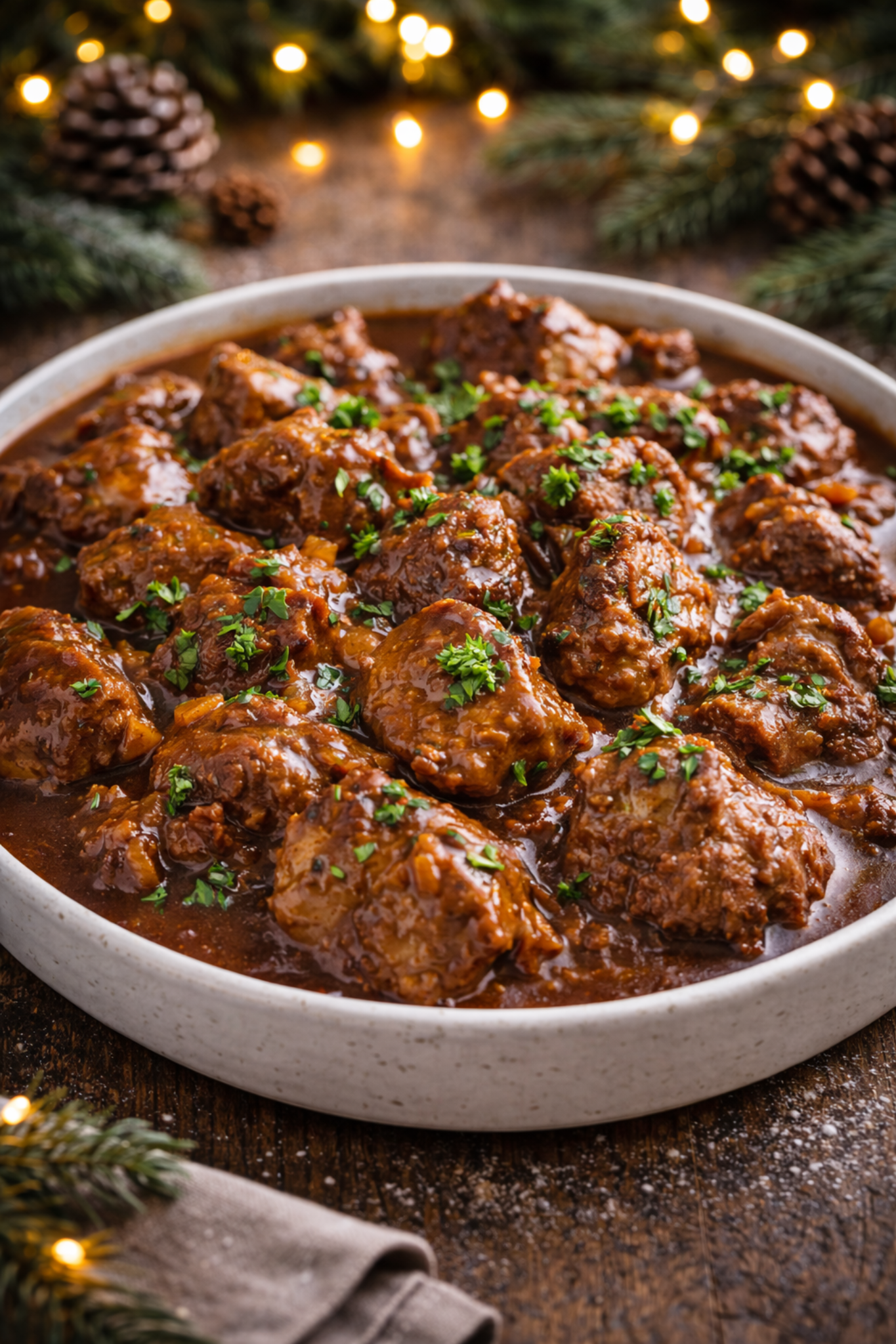 Dodaj mięso z powrotem, wlej bulion, dodaj majeranek i duś pod przykryciem 30–40 minut, aż mięso będzie miękkie.