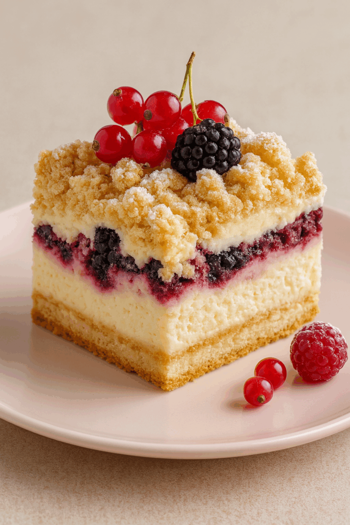 Na podpieczony spód wyłożyć część masy serowej (około 3/4), na niej ułożyć warstwę owoców (maliny, jeżyny, porzeczki).