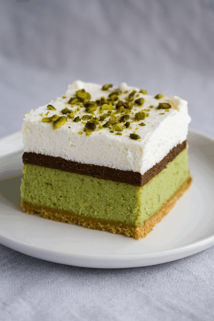 Sernik pistacjowy z warstwą czekoladową i pianką śmietankową