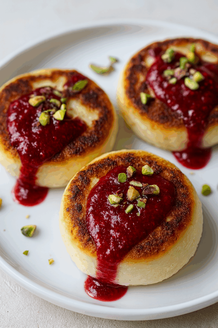 Serniki podawaj z sosem malinowym i posypane pistacjami.