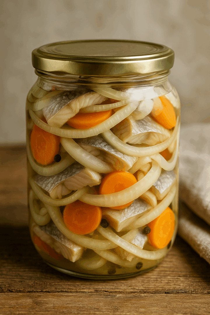 W czystym słoju układaj warstwami: śledzie, cebulę, marchewkę, ziarenka pieprzu i ziela angielskiego.