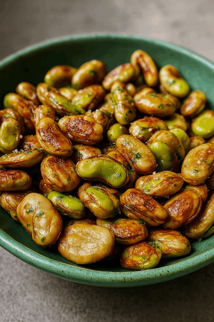 Dodaj ugotowany bób i smaż kilka minut, aż lekko się zrumieni z każdej strony.