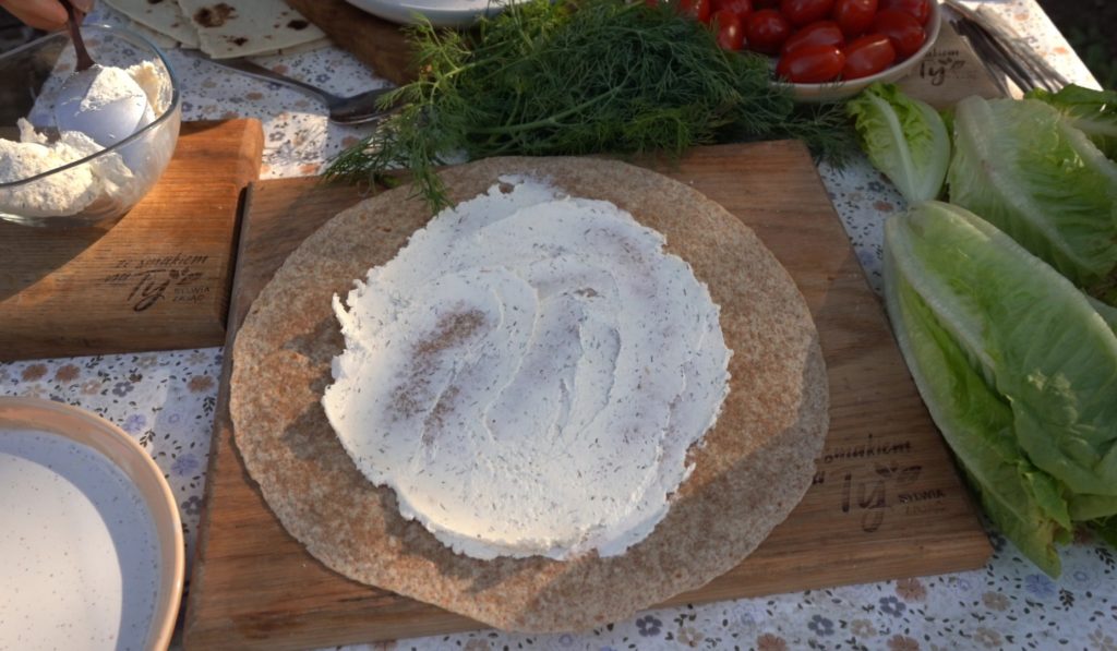 Na środek placka tortilli wyłóż serek. Rozsmaruj. Na serek wyłóż sałatę. Na sałatę wyłóż pokrojone pomidorki koktajlowe.
