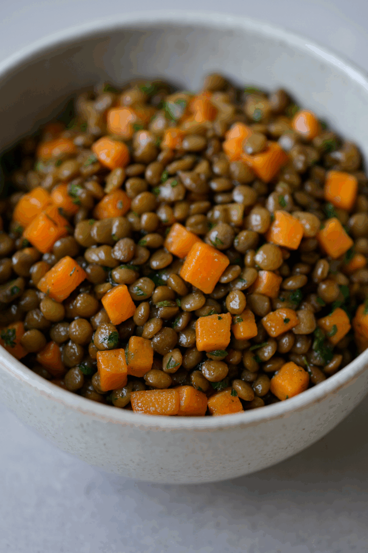 Przepłucz soczewicę, następnie ugotuj w lekko osolonej wodzie przez ok. 20–25 minut, aż będzie miękka, ale nie rozgotowana. Odcedź i odstaw.
