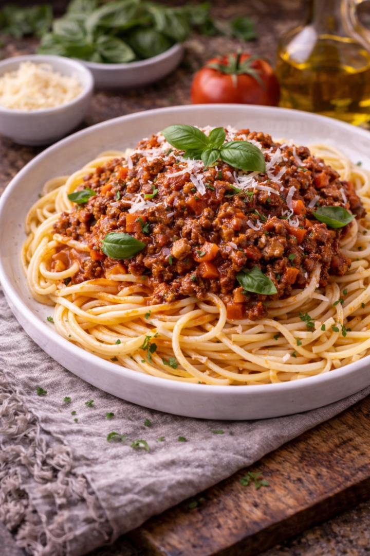 Spaghetti podawać z sosem, posypane parmezanem i udekorowane bazylią.