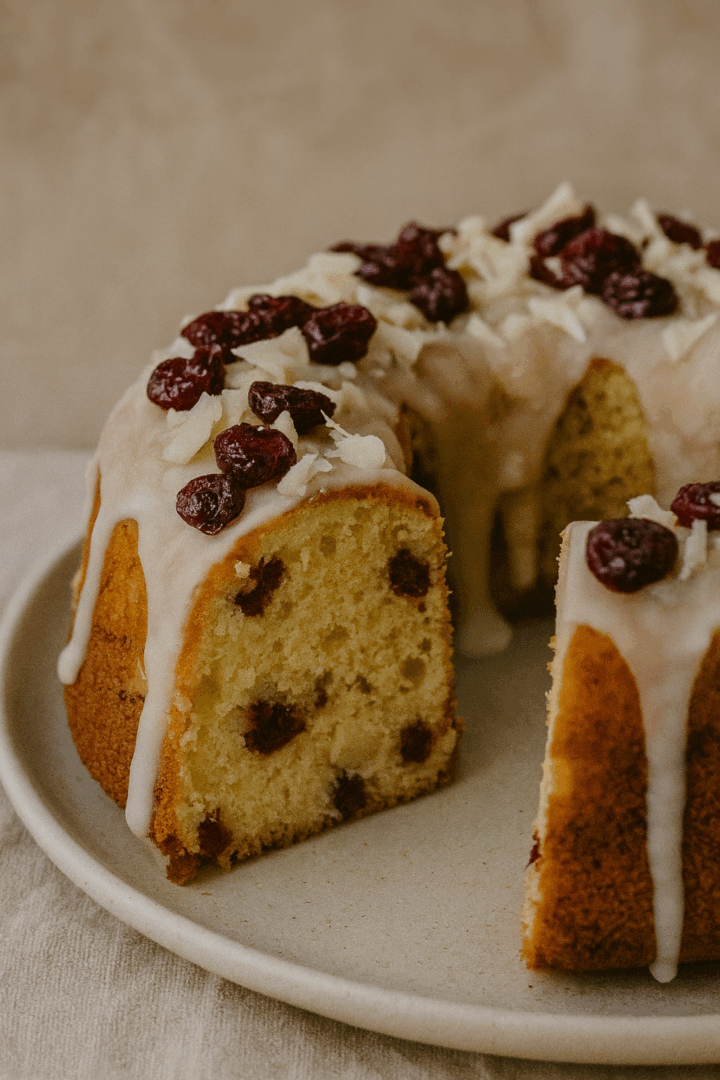 Polej lukrem i udekoruj żurawiną oraz wiórkami czekolady.
