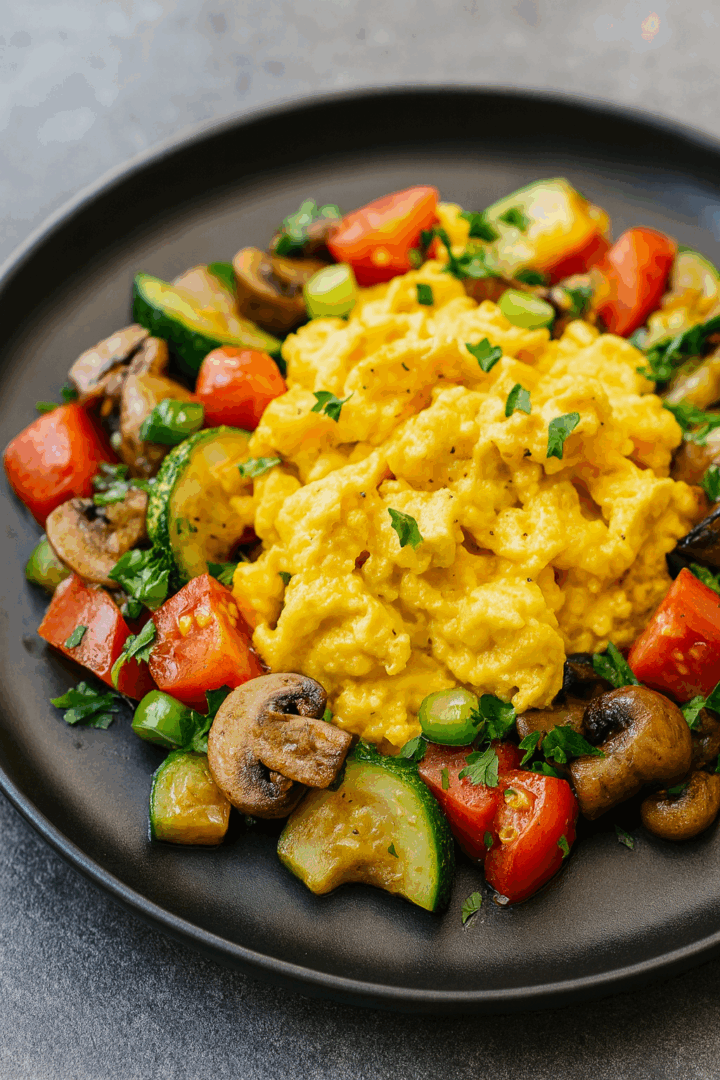 Podawaj jajecznicę z warzywami, posypaną natką pietruszki.