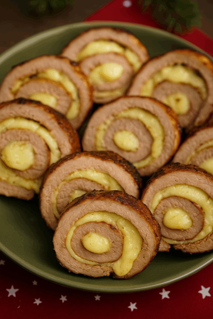 Ułóż plastry sera, zwiń w roladę i zwiąż sznurkiem.