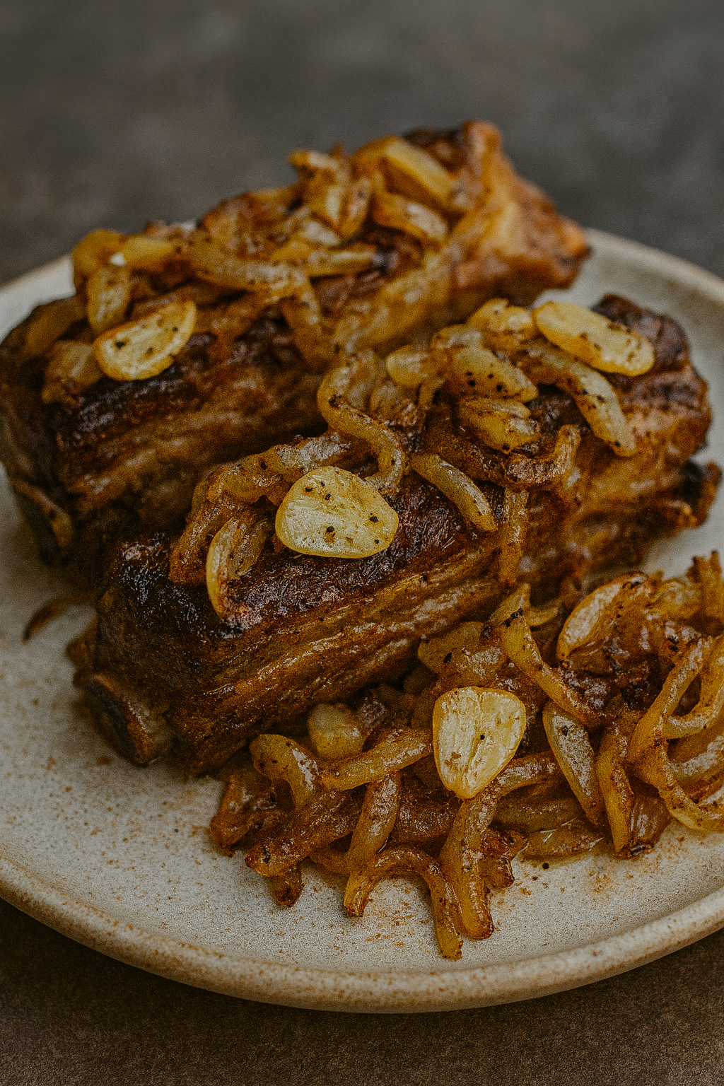 Pieczeń z boczku wieprzowego z duszoną cebulą i czosnkiem