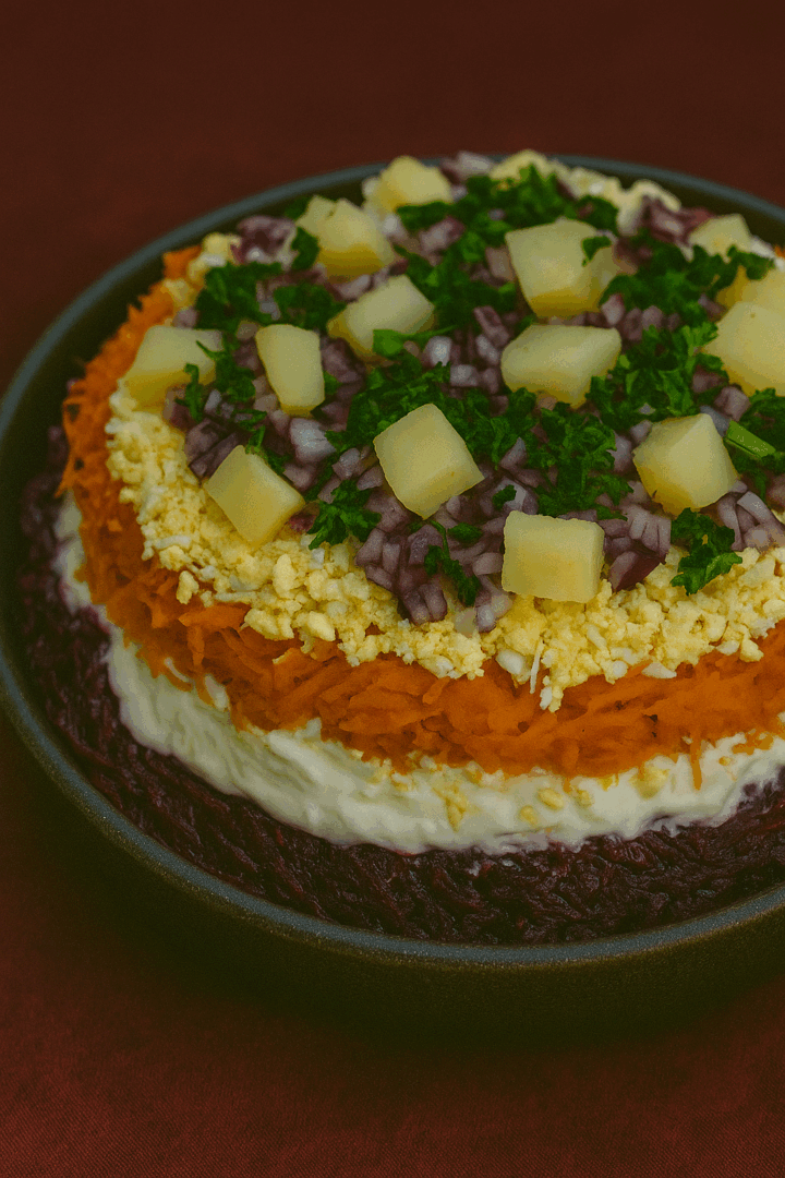 Buraki zetrzeć i ułożyć jako pierwszą warstwę.