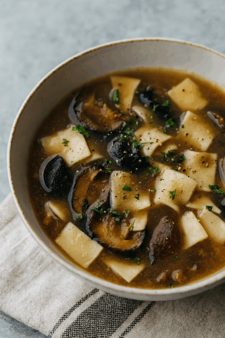 Ugotuj łazanki i podawaj z gorącym wywarem grzybowym.