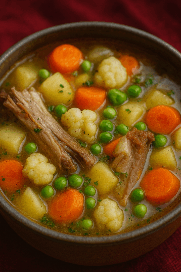 Przelej zupę do misek – powinna być gęsta, pełna dużych kawałków warzyw, kalafiora, groszku oraz miękkich kawałków mięsa zanurzonych w aromatycznym świątecznym bulionie.