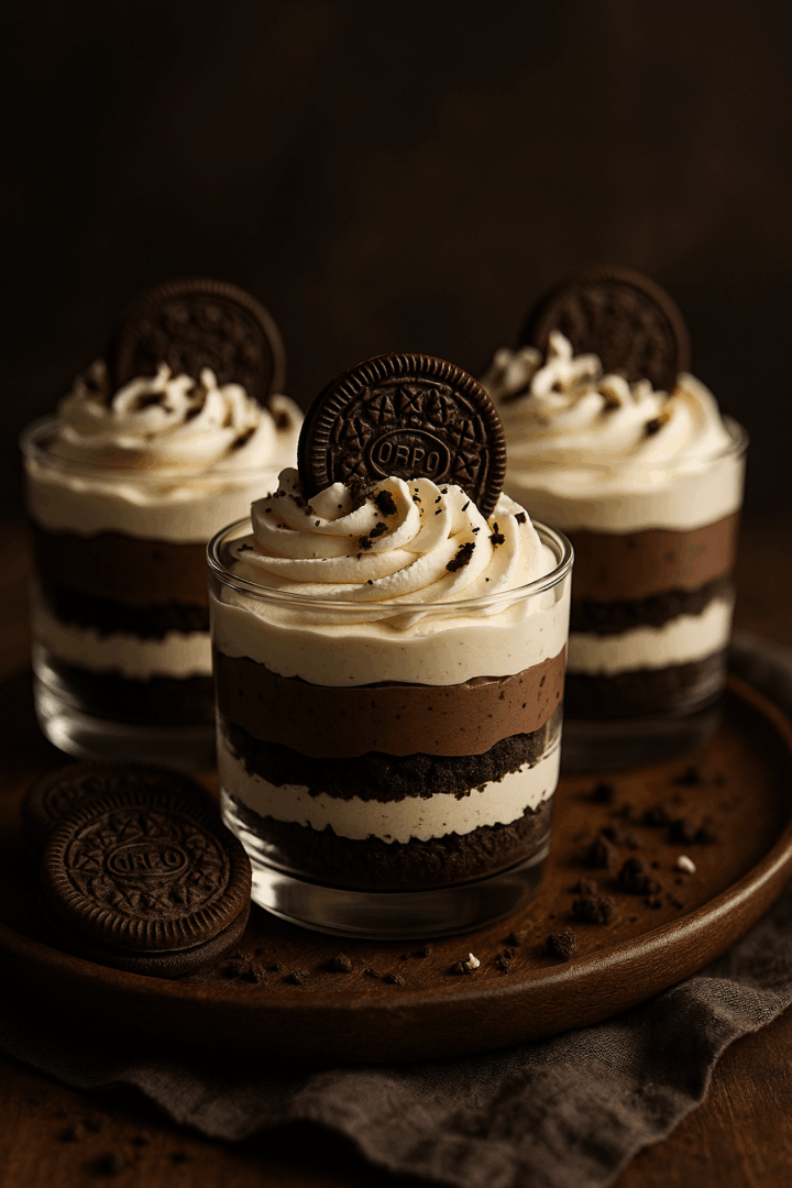 Na każdym deserze umieść jedno całe ciasteczko Oreo oraz posyp wierzch kilkoma drobnymi okruszkami. Podawaj schłodzone, jako świąteczny, efektowny deser w wersji mini.