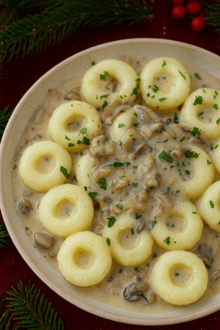 Kluski podawaj z gorącym sosem grzybowym i świeżą natką pietruszki.