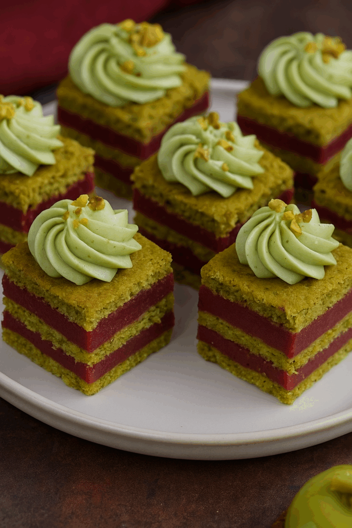 Pokrój w kostki i udekoruj kremem pistacjowym oraz posiekanymi pistacjami.