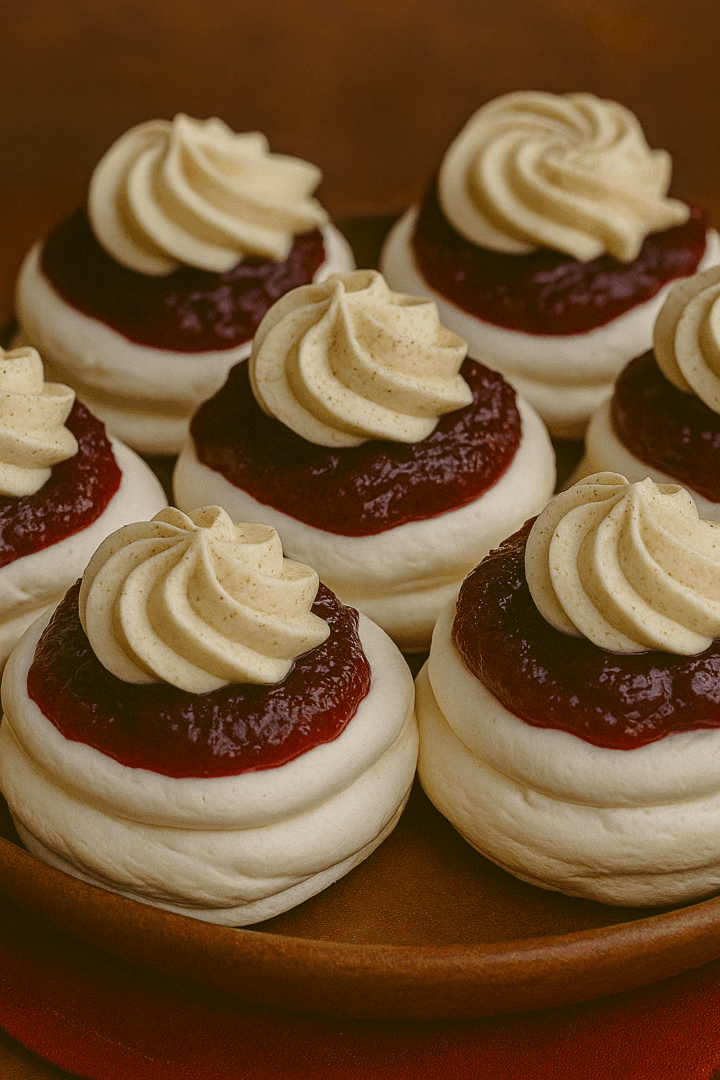 Świąteczne mini bezy z kremem waniliowym i konfiturą żurawinową