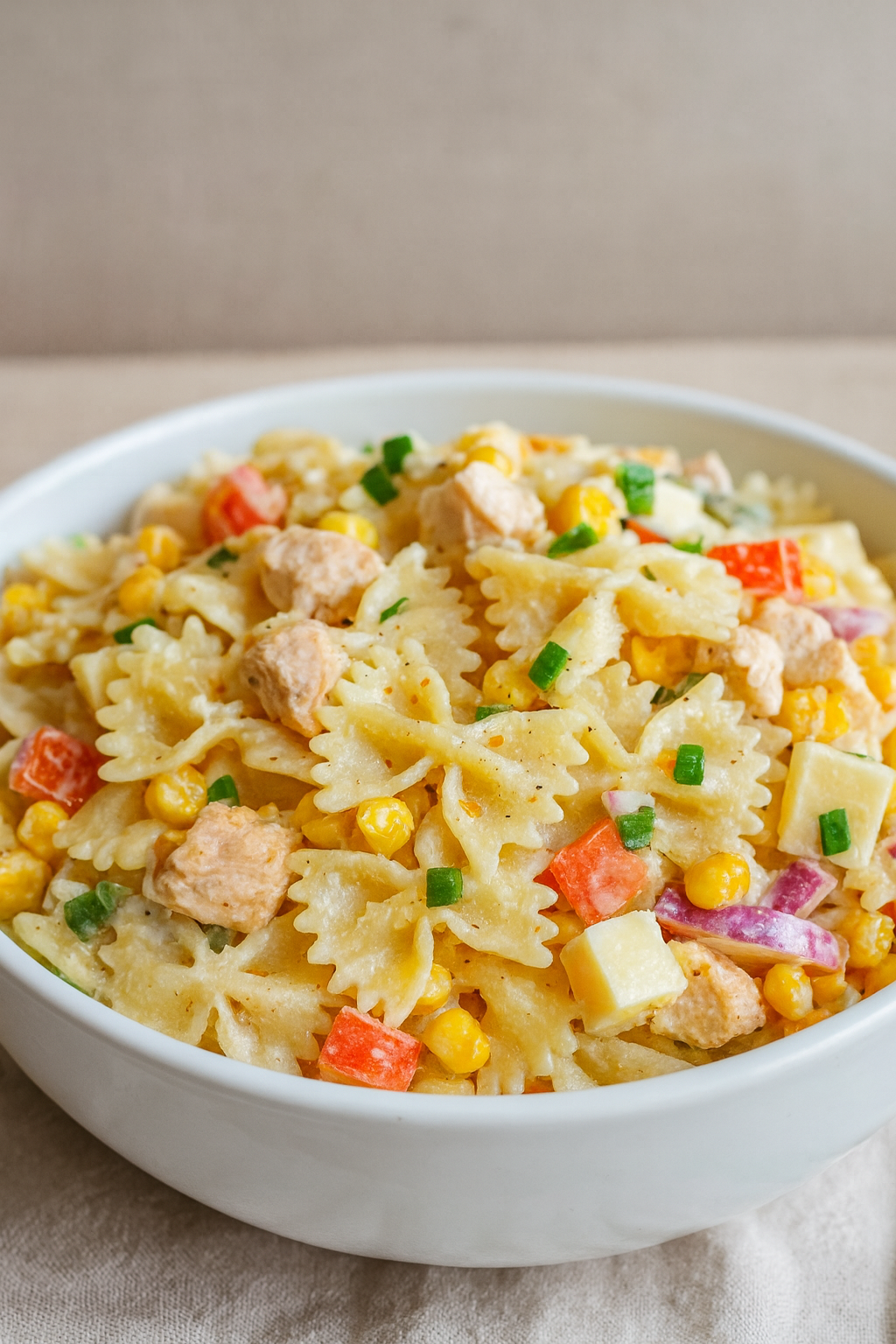 Sałatka z makaronem, kurczakiem i kukurydzą