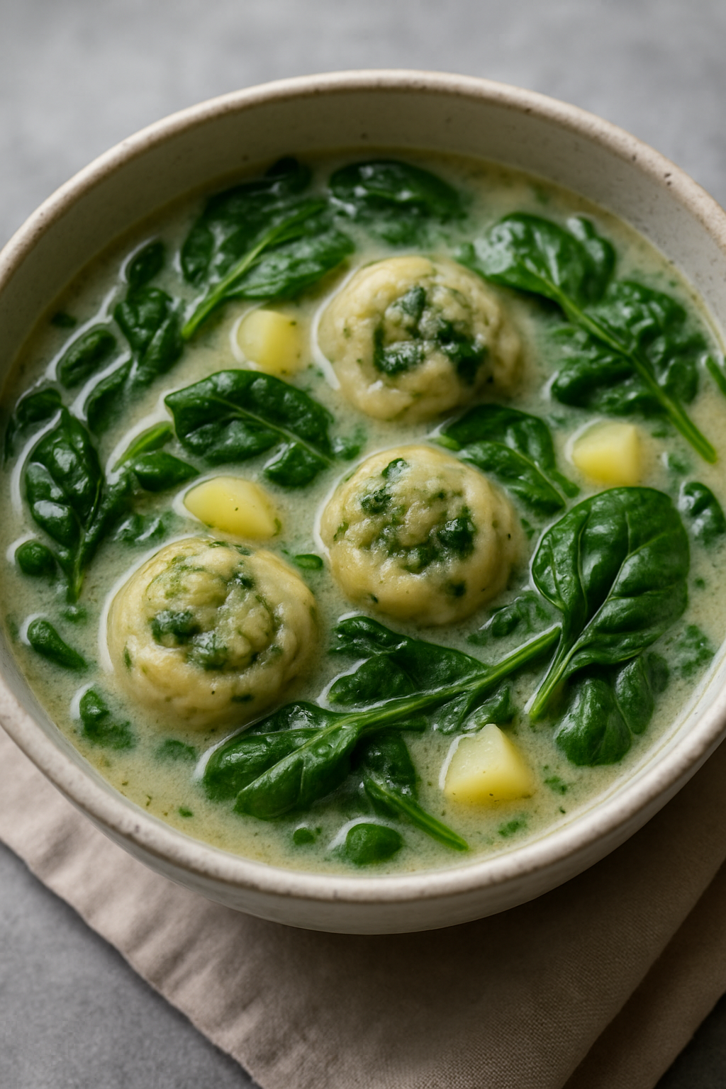 Składniki: Składniki na zupę 1 litr bulionu warzywnego lub drobiowego 300 g świeżego szpinaku 2 ziemniaki 1 cebula…