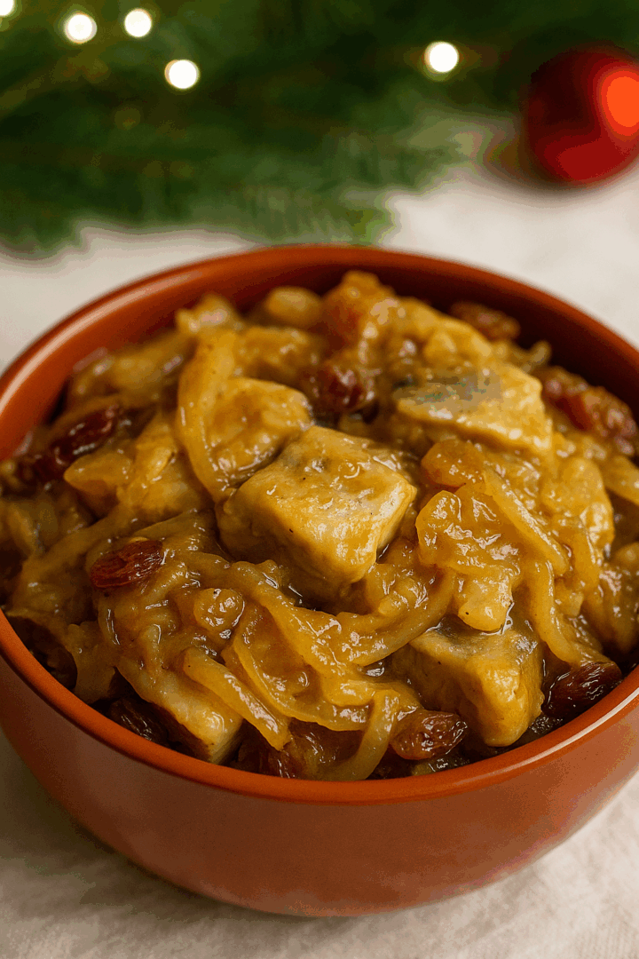 Wymieszaj majonez ze śmietaną, połącz z cebulą i rodzynkami.