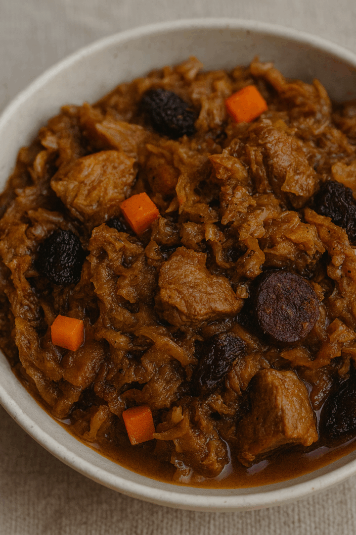 Świąteczny bigos staropolski z mięsem i śliwkami
