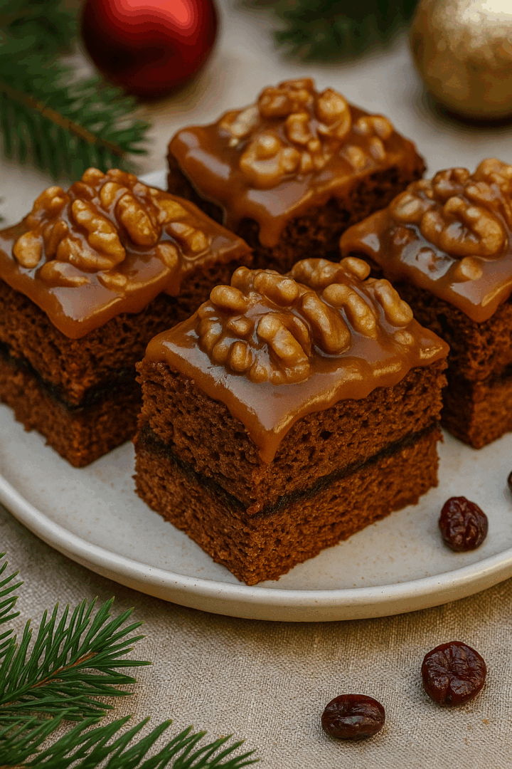 Na patelni przygotuj karmel, wylej na wierzch ciasta i udekoruj orzechami.