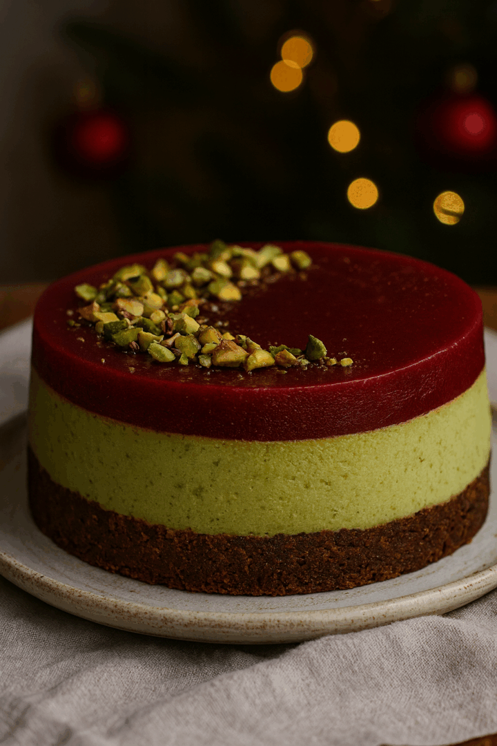 Świąteczny sernik pistacjowy z warstwą malinową na korzennym spodzie
