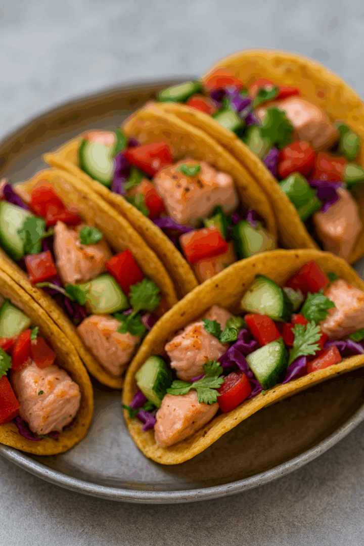 Podgrzej tortille lub muszle taco (na suchej patelni lub w piekarniku przez 2–3 minuty).