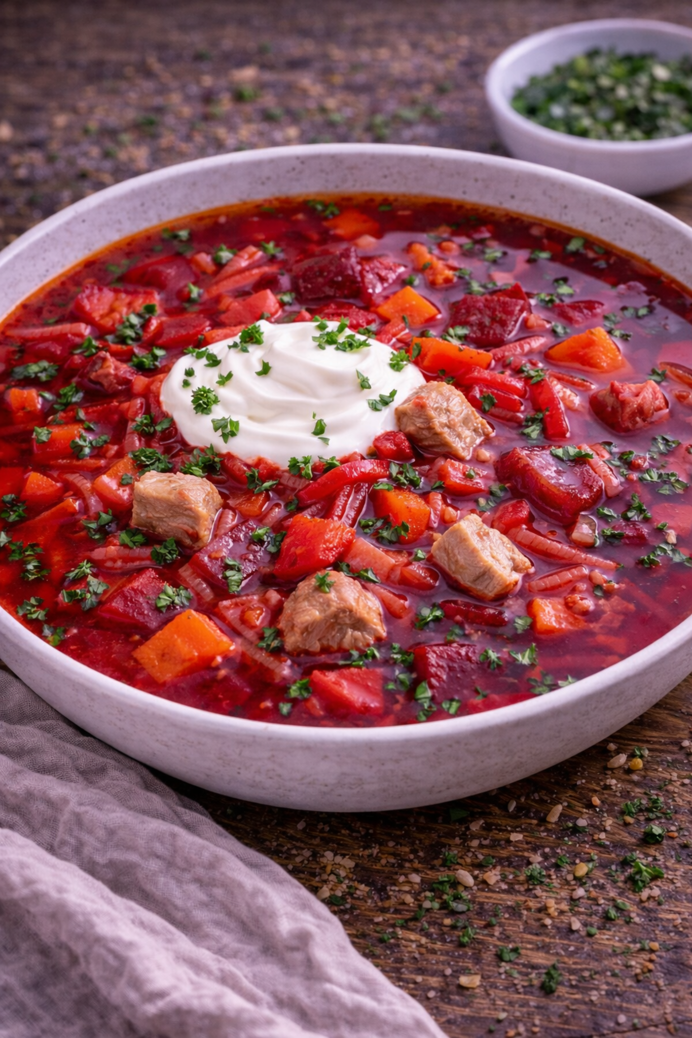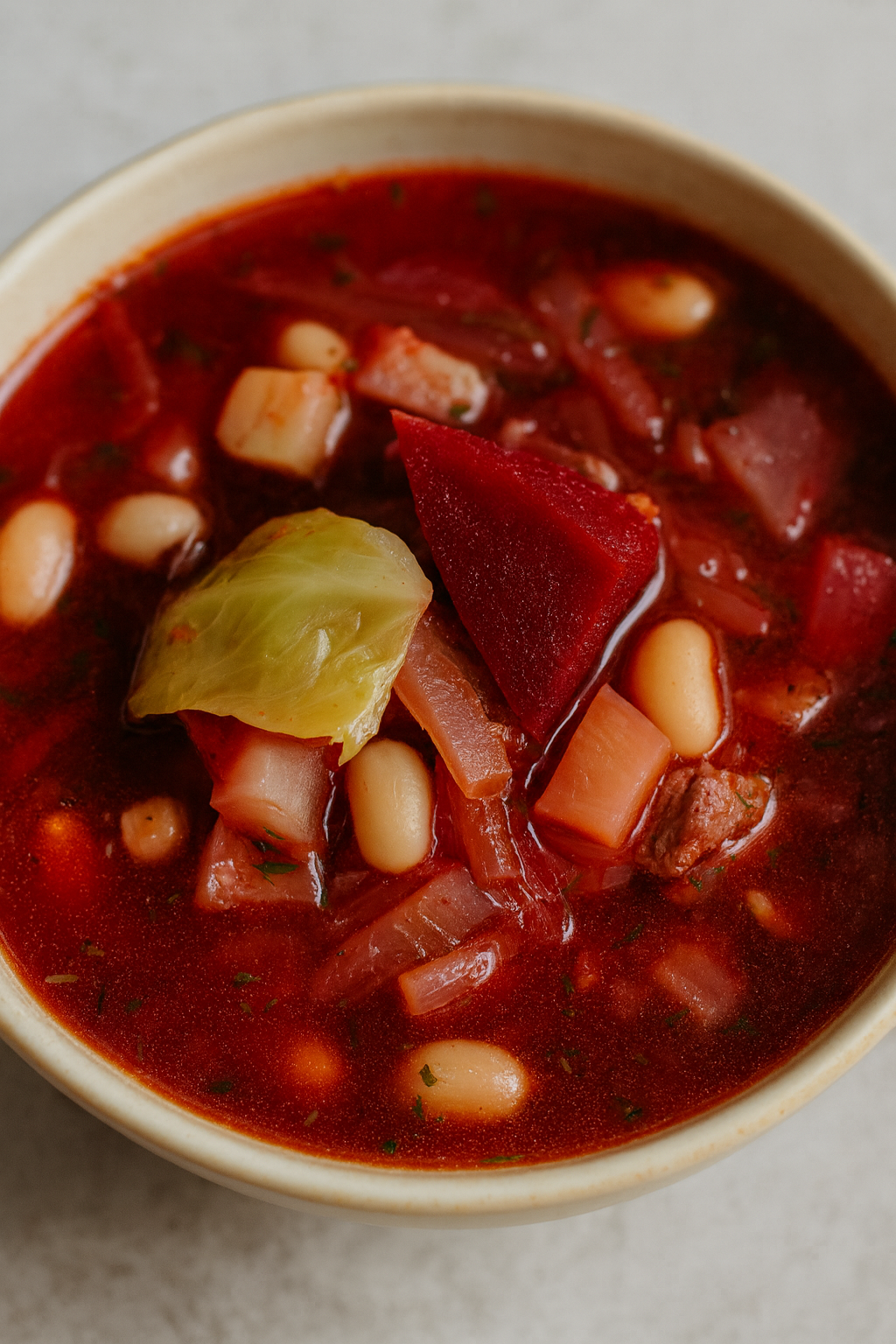Składniki: 500 g mięsa wieprzowego lub wołowego (łopatka, karkówka lub żeberka) 1,5 l wody lub bulionu 3–4 buraki…