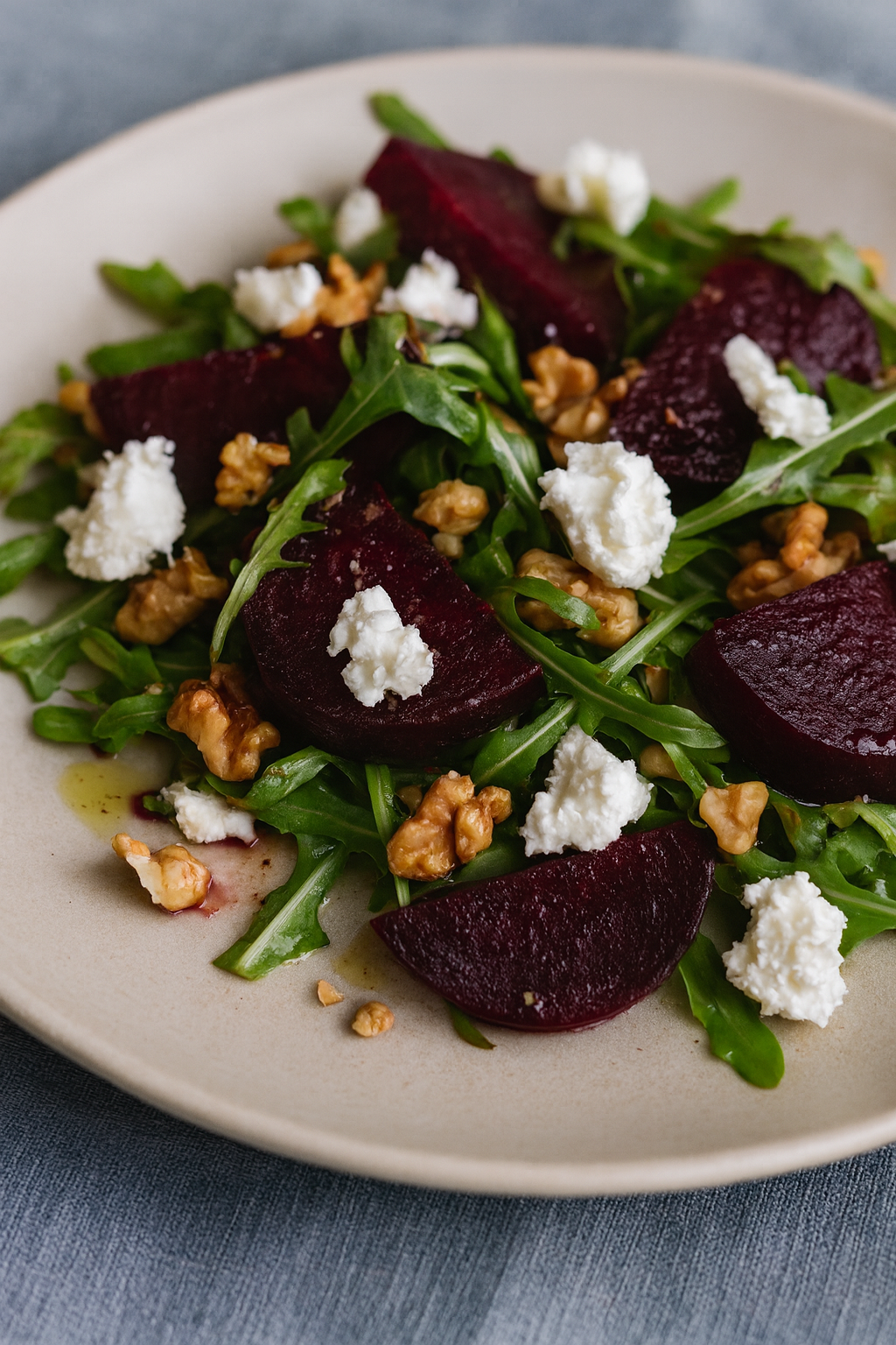 Składniki: 3 pieczone buraki, pokrojone w kostkę 120 g sera koziego w roladzie 70 g orzechów włoskich 100…