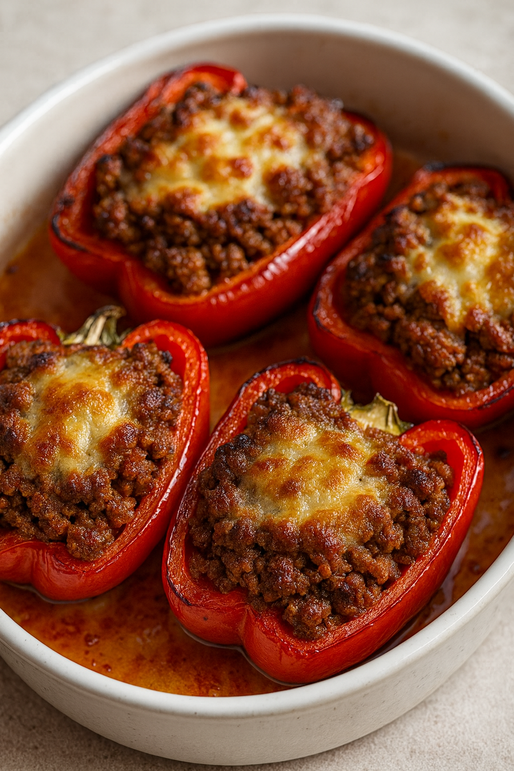 Składniki: (na ok. 4 porcje): 4 duże czerwone papryki 500 g mięsa mielonego (wołowo-wieprzowe lub drobiowe) 1 cebula…